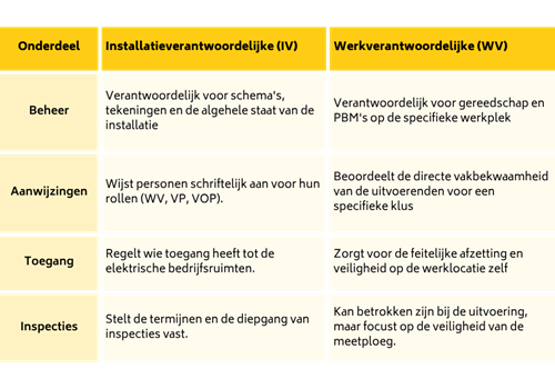 De Installatieverantwoordelijke (IV) is verantwoordelijk voor de algehele staat, het beheer en de veilige bedrijfsvoering van de installatie op de lange termijn. De Werkverantwoordelijke (WV) richt zich juist op de uitvoering en is direct verantwoordelijk voor de veiligheid tijdens werkzaamheden op de werkplek. Samen vormen deze rollen een essentieel onderdeel van een veilige en gestructureerde elektrotechnische bedrijfsvoering.